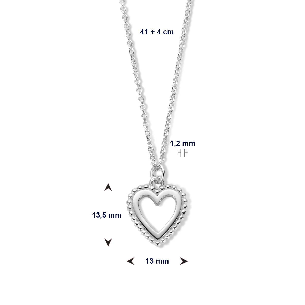 Gerhodineerd 925 zilveren collier uitgevoerd met een hart. Het collier heeft een schakelbreedte van 1.2mm en is uitgevoerd met karabijnsluiting. De draaglengte is 41cm met een extensie van 4cm.