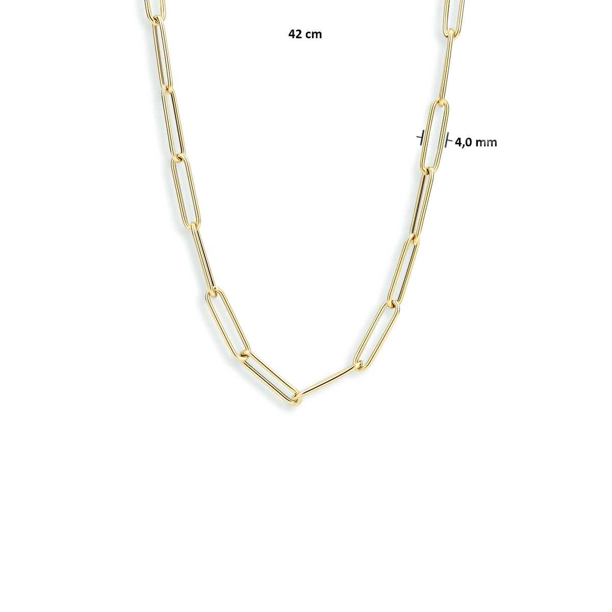 14k Geelgouden collier uitgevoerd met een paperclip schakel met een breedte van 4mm. Het collier heeft een draaglengte van 42cm en een stevige karabijn sluiting.
