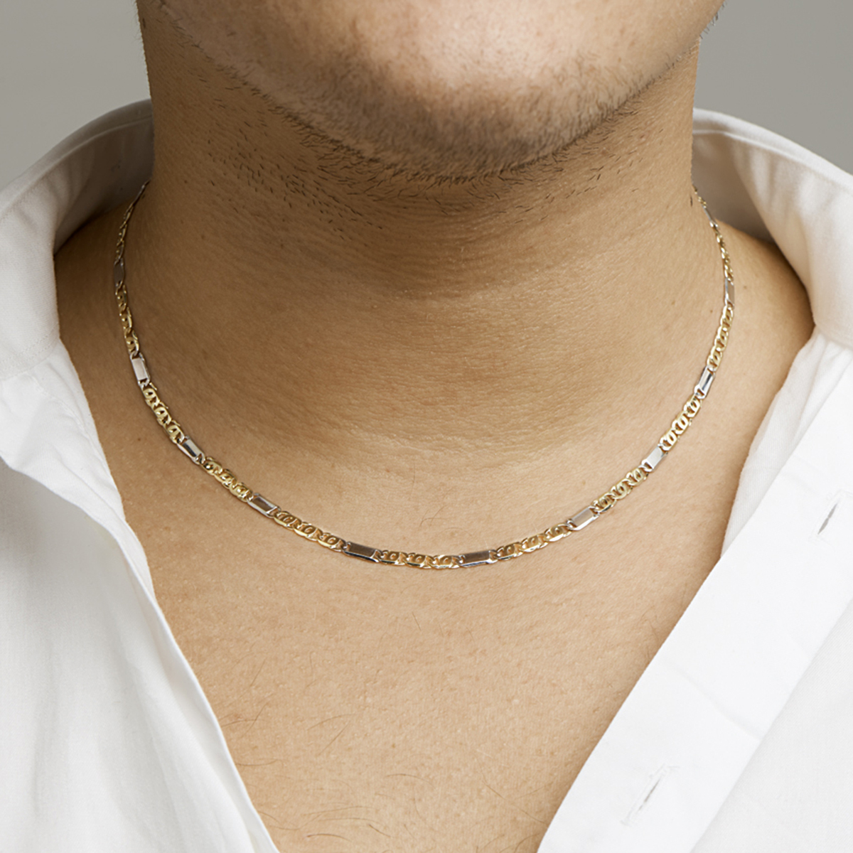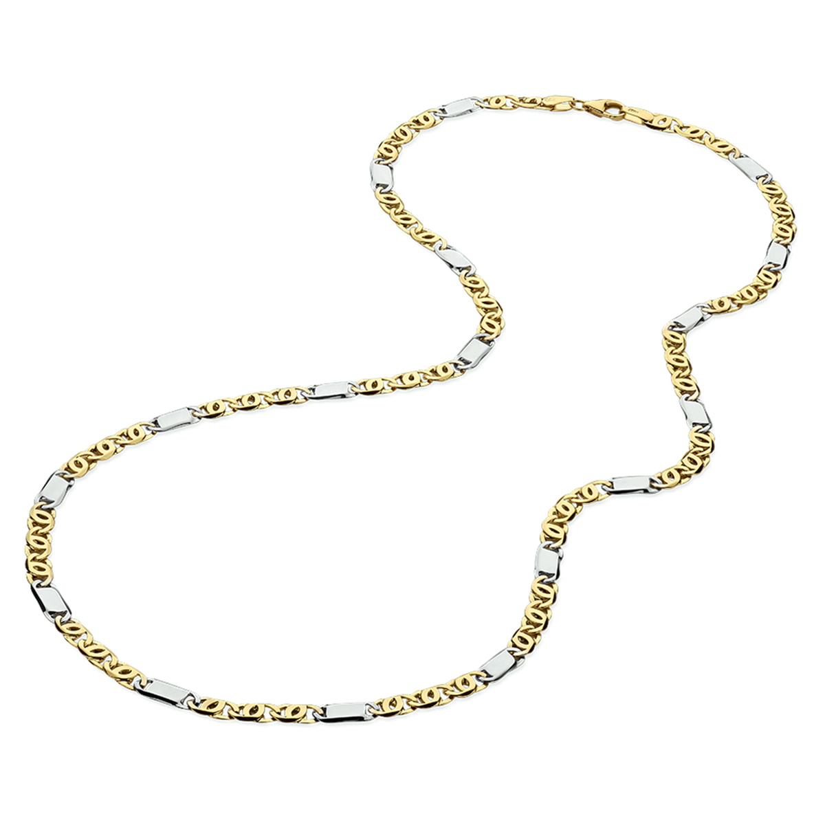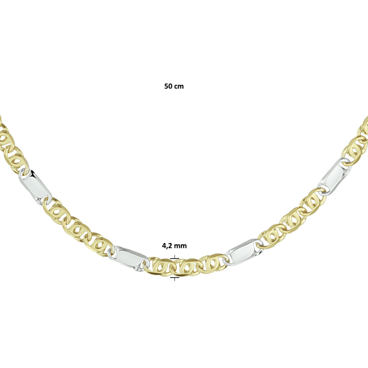 14k Bicolor geel- en witgouden valkenoog collier. Het collier heeft een draaglengte van 50cm en een stevige karabijn sluiting.