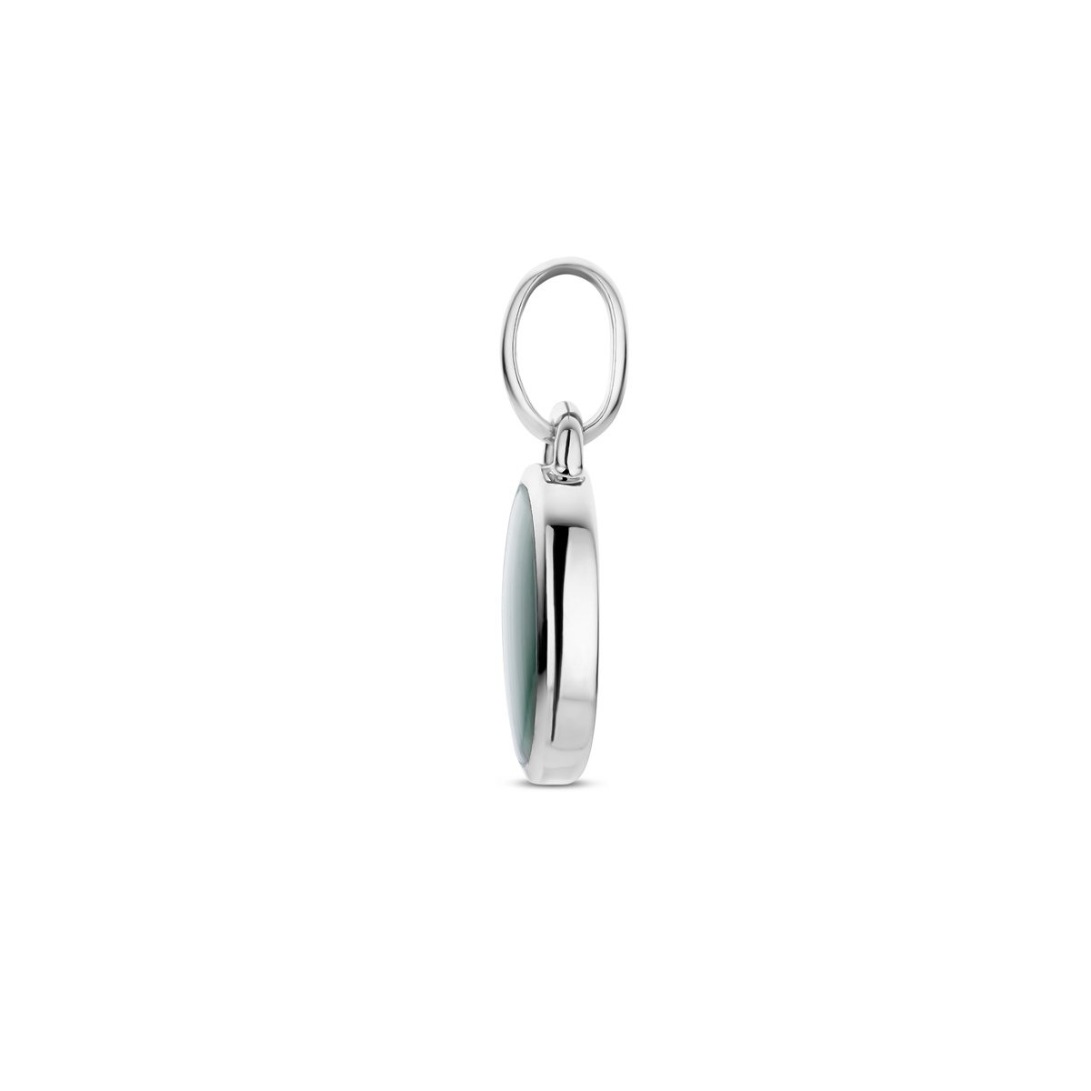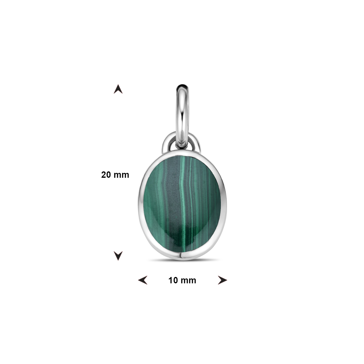 Gerhodineerd 925 zilveren hanger uitgevoerd met malachiet. De hanger heeft een totale hoogte van 20mm en een breedte van 10mm.