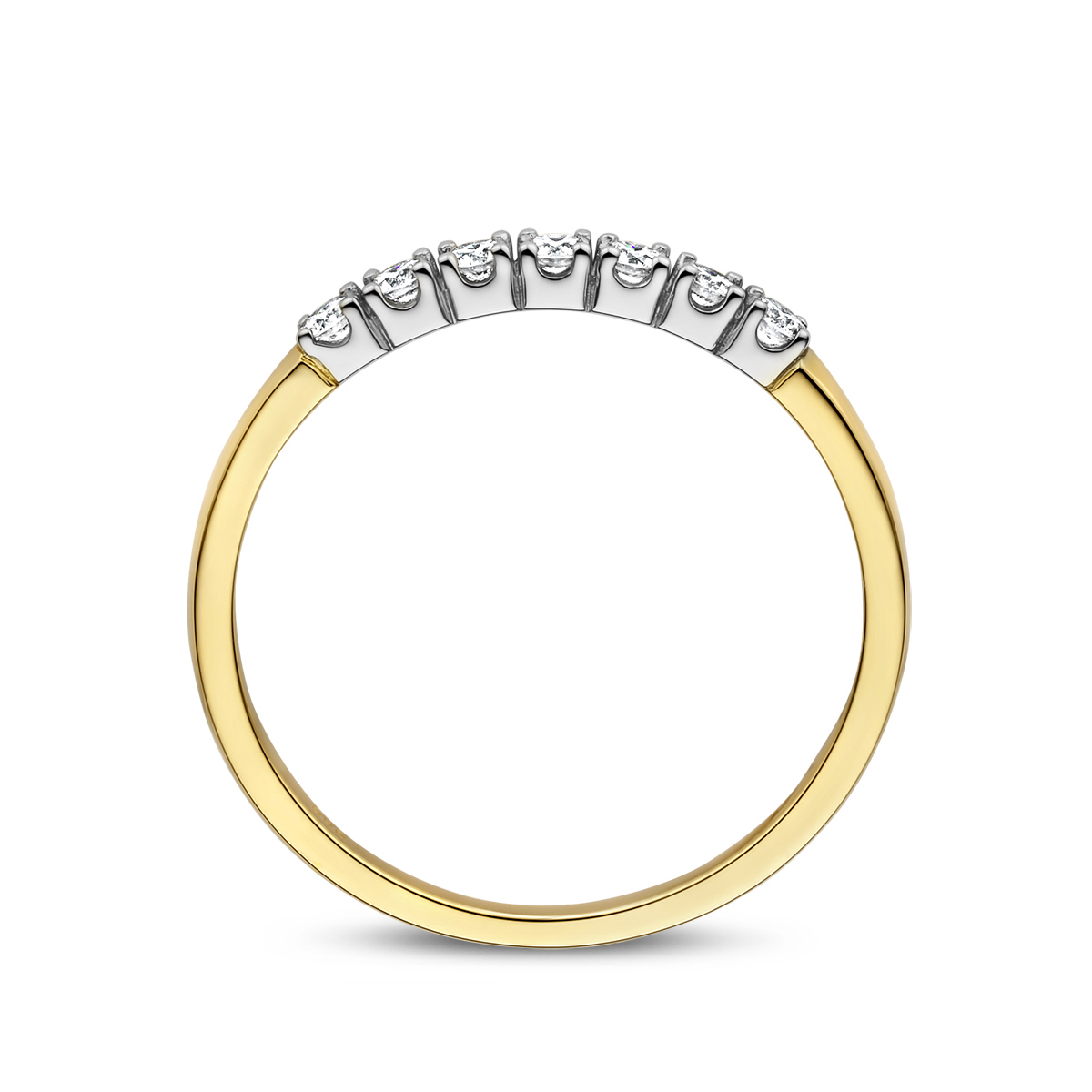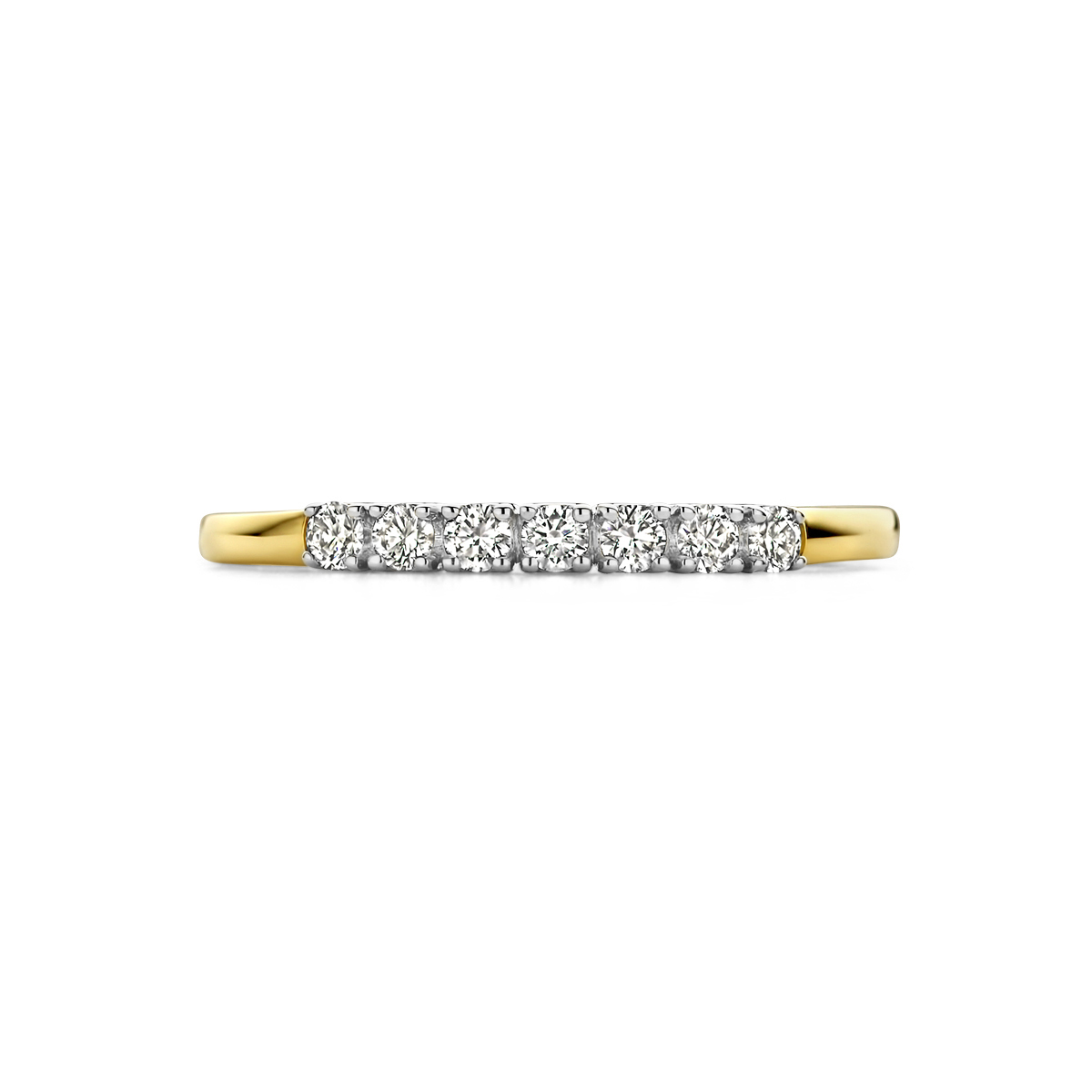 14k Bicolor geel- en witgouden ring uitgevoerd met een diamant rij. De ring heeft een breedte van 2mm.