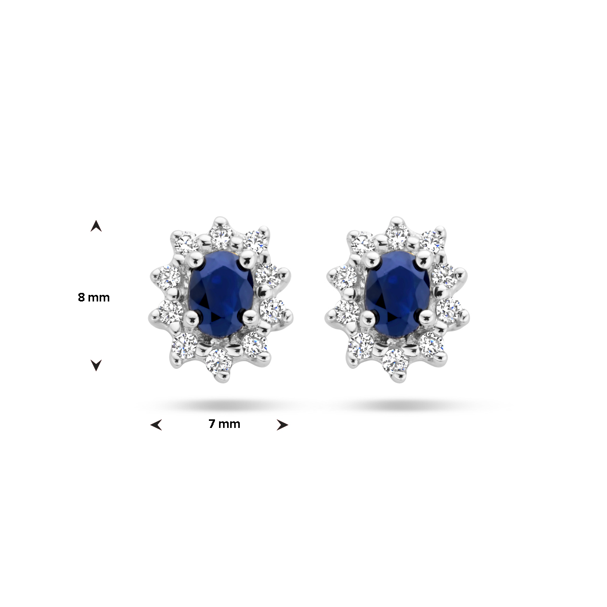 Beschrijving: Oorknoppen in de stijl van de bekende verlovingsring van prinses Diana. Sieraden met Koninklijke allure. Details: Witgouden oorknoppen met saffier en zirkonia. De oorknoppen zijn onderdeel van een set.