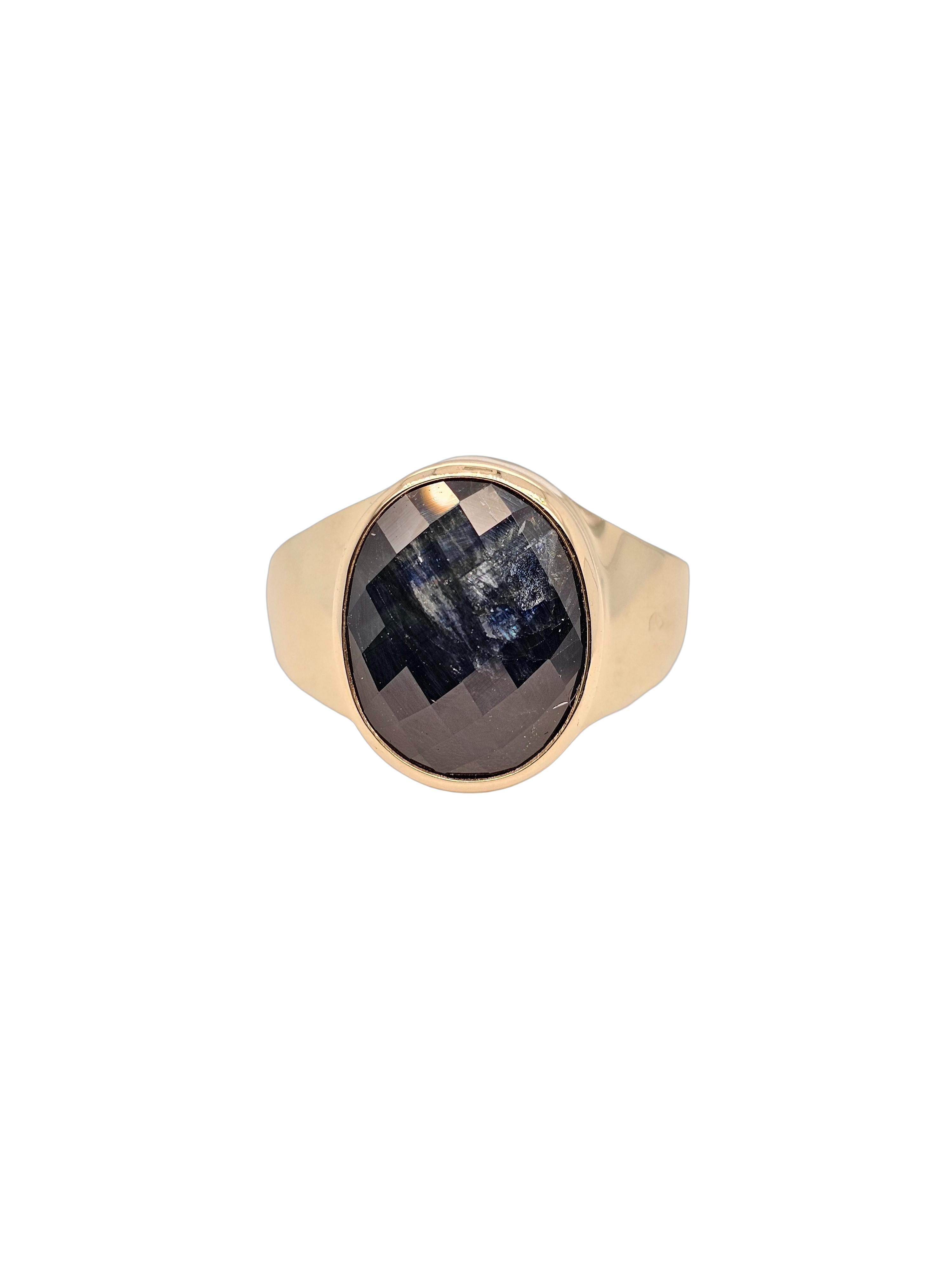 prachtige mantelring van 14karaat geelgoud met een grote saffier!
