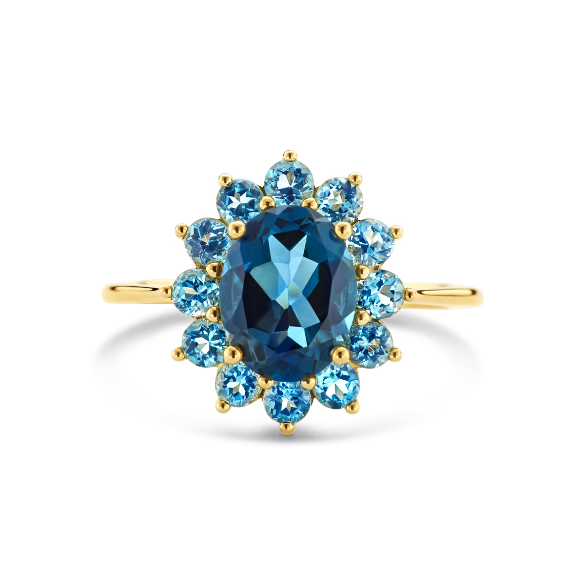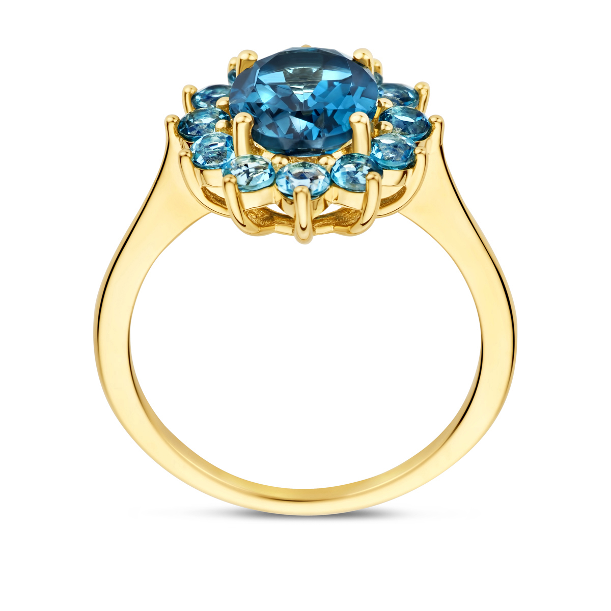 14k Geelgouden ring uitgevoerd met blauw topaas en London blue topaas. De ring heeft een breedte van 15mm.