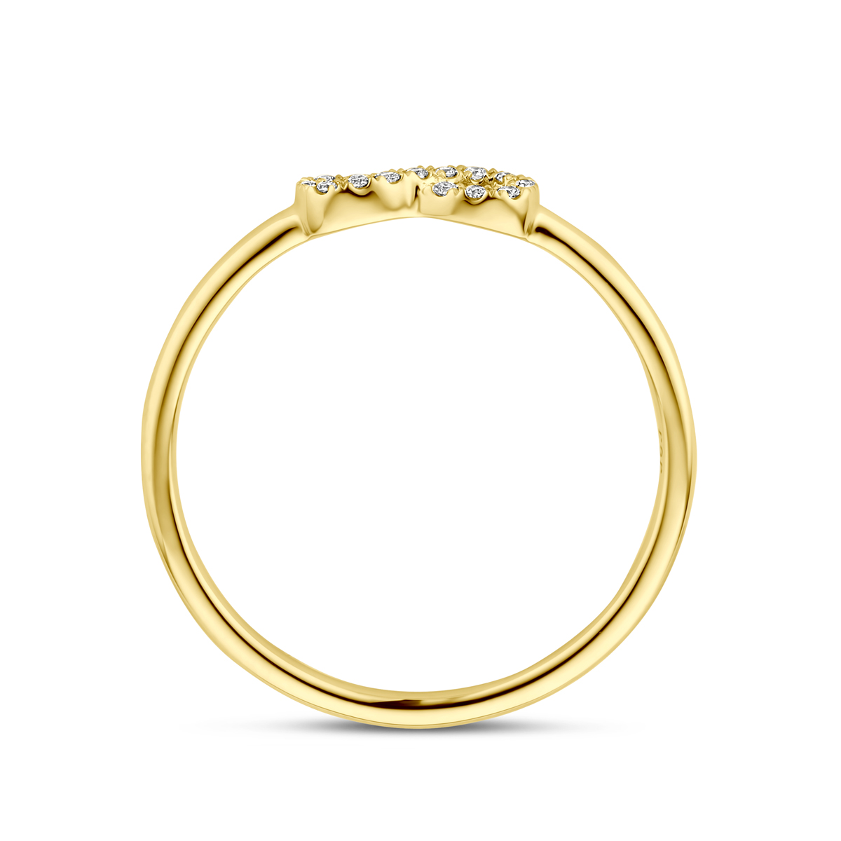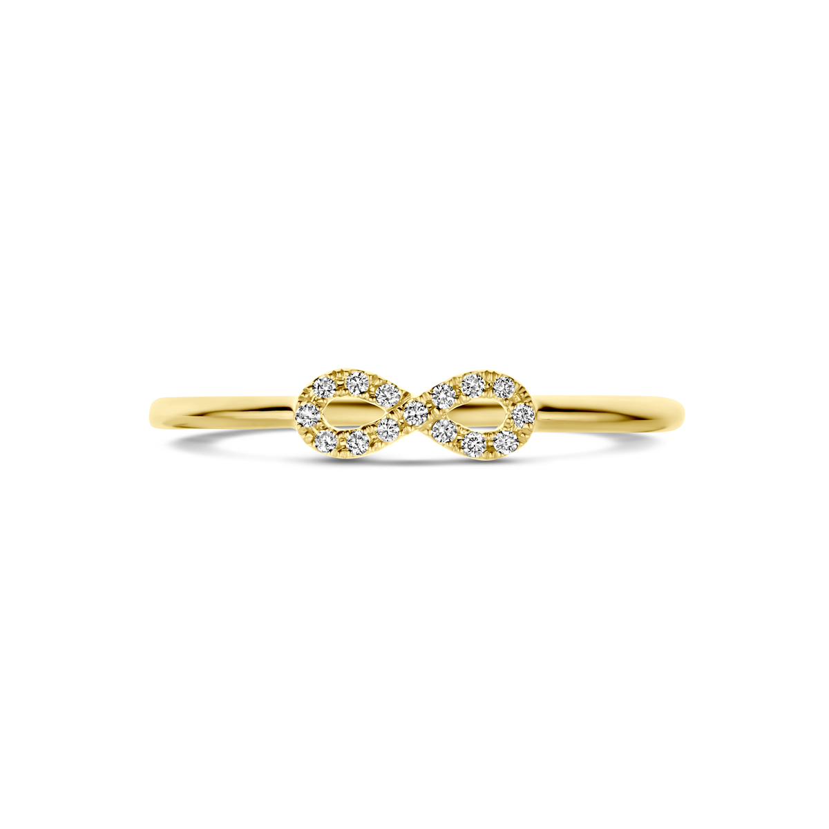 14k Geelgouden ring uitgevoerd met infinity en diamant. De ring heeft een afmeting van 3.5x9mm. De totale diamantgewicht is 0.05ct.