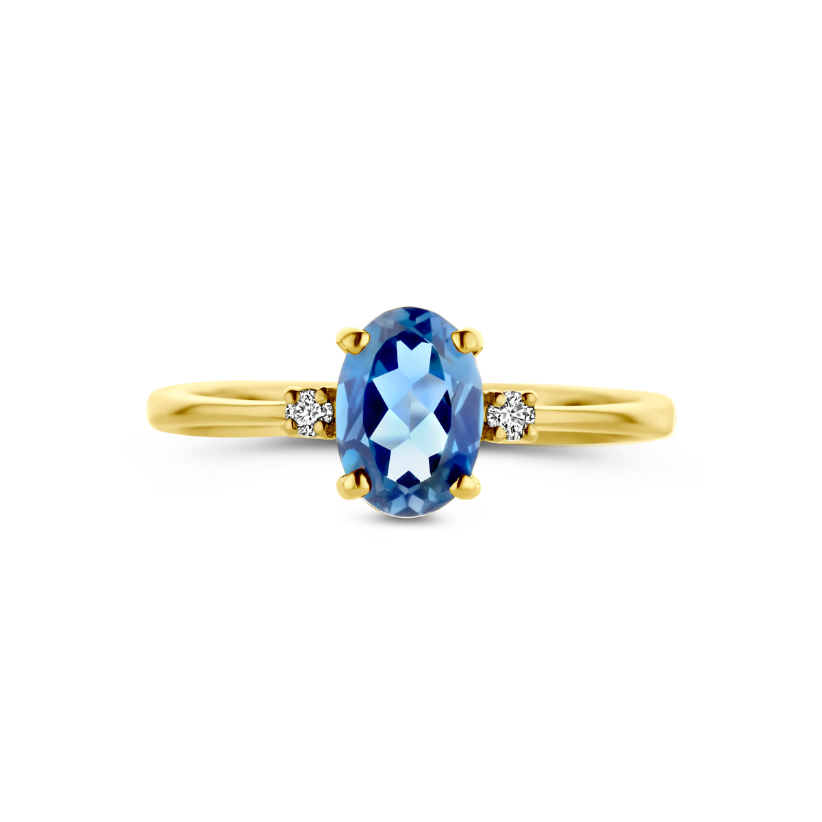 14k Geelgouden ring uitgevoerd met london blue topaas en diamant. De ring heeft een afmeting van 7x5mm. Het diamantgewicht is 0.04ct.