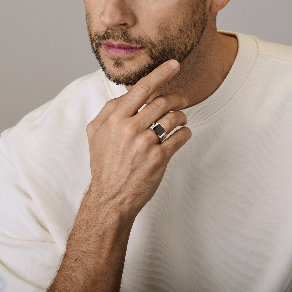 Gerhodineerd 925 zilveren zegelring uitgevoerd met onyx. De ring heeft een breedte van 10.5mm.